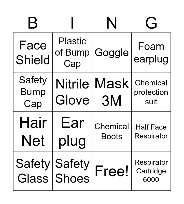 This bingo card has 17 words: Free!, Safety Glass, Goggle, Face Shield, Ear plug, Foam earplug, Half Face Respirator, Mask 3M, Chemical protection suit, Nitrile Glove, Safety Shoes, Chemical Boots, Safety Bump Cap, Plastic of Bump Cap, Hair Net, Safety Hard hat and Respirator Cartridge 6000.