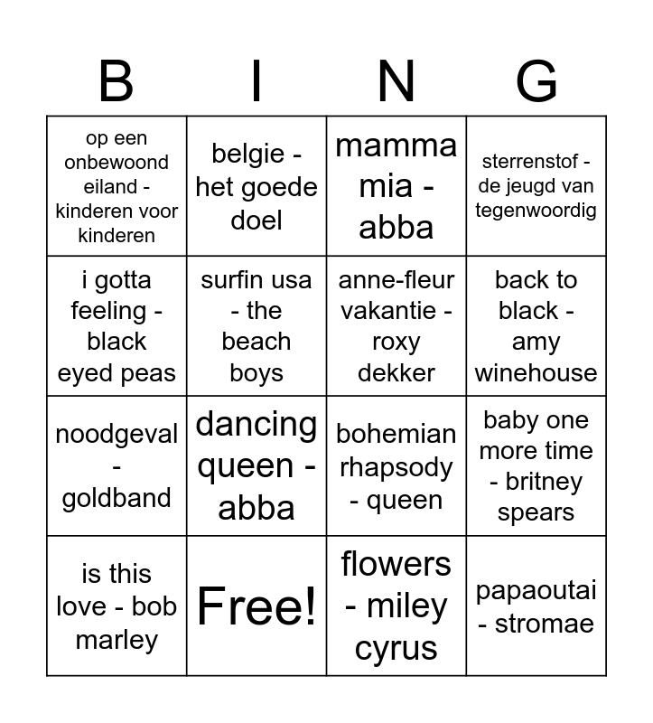 This bingo card has 21 words: Free!, erop of eronder - pommelien thijs, belgie - het goede doel, europapa- joost, flowers - miley cyrus, anne-fleur vakantie - roxy dekker, op een onbewoond eiland - kinderen voor kinderen, mamma mia - abba, bohemian rhapsody - queen, back to black - amy winehouse, noodgeval - goldband, sterrenstof - de jeugd van tegenwoordig, papaoutai - stromae, pokemon theme - pokemon, surfin usa - the beach boys, could you be loves - bob marley, is this love - bob marley, dancing queen - abba, i gotta feeling - black eyed peas, baby one more time - britney spears and oya.