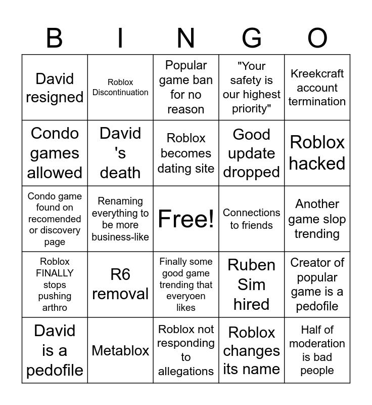 This bingo card has a free space and 24 words: David is a pedofile, R6 removal, Roblox becomes dating site, Roblox changes its name, Kreekcraft account termination, David resigned, Roblox Discontinuation, Popular game ban for no reason, Connections to friends, Another game slop trending, Condo game found on recomended or discovery page, David 's death, Ruben Sim hired, Creator of popular game is a pedofile, Condo games allowed, Metablox, Roblox not responding to allegations, "Your safety is our highest priority", Roblox hacked, Roblox FINALLY stops pushing arthro, Renaming everything to be more business-like, Finally some good game trending that everyoen likes, Good update dropped and Half of moderation is bad people.