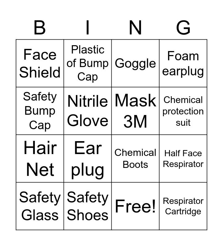 This bingo card has 17 words: Free!, Safety Glass, Goggle, Face Shield, Ear plug, Foam earplug, Half Face Respirator, Mask 3M, Chemical protection suit, Nitrile Glove, Safety Shoes, Chemical Boots, Safety Bump Cap, Plastic of Bump Cap, Hair Net, Safety Hard hat and Respirator Cartridge.