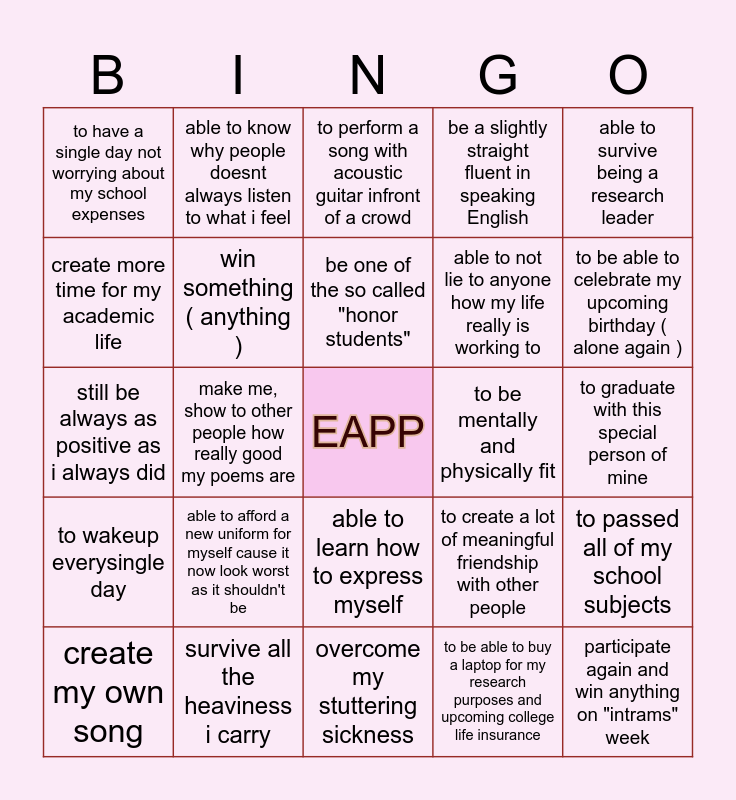 This bingo card has a free space and 24 words: create my own song, able to afford a new uniform for myself cause it now look worst as it shouldn't be, be one of the so called "honor students", to be able to buy a laptop for my research purposes and upcoming college life insurance, able to survive being a research leader, to have a single day not worrying about my school expenses, able to know why people doesnt always listen to what i feel, to perform a song with acoustic guitar infront of a crowd, to be mentally and physically fit, to graduate with this special person of mine, still be always as positive as i always did, win something ( anything ), to create a lot of meaningful friendship with other people, to passed all of my school subjects, create more time for my academic life, survive all the heaviness i carry, overcome my stuttering sickness, be a slightly straight fluent in speaking English, to be able to celebrate my upcoming birthday ( alone again ), to wakeup everysingle day, make me, show to other people how really good my poems are, able to learn how to express myself, able to not lie to anyone how my life really is working to and participate again and win anything on "intrams" week.