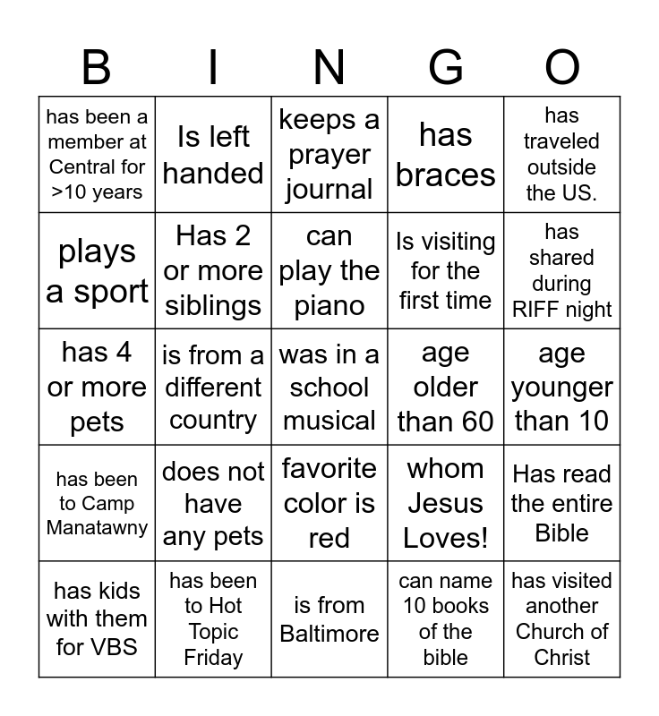 This bingo card has 25 words: does not have any pets, is from Baltimore, can play the piano, has kids with them for VBS, has traveled outside the US., has been a member at Central for >10 years, plays a sport, Is left handed, age older than 60, favorite color is red, Is visiting for the first time, has 4 or more pets, whom Jesus Loves!, Has read the entire Bible, Has 2 or more siblings, has visited another Church of Christ, age younger than 10, keeps a prayer journal, has shared during RIFF night, is from a different country, was in a school musical, has been to Hot Topic Friday, has been to Camp Manatawny, has braces and can name 10 books of the bible.