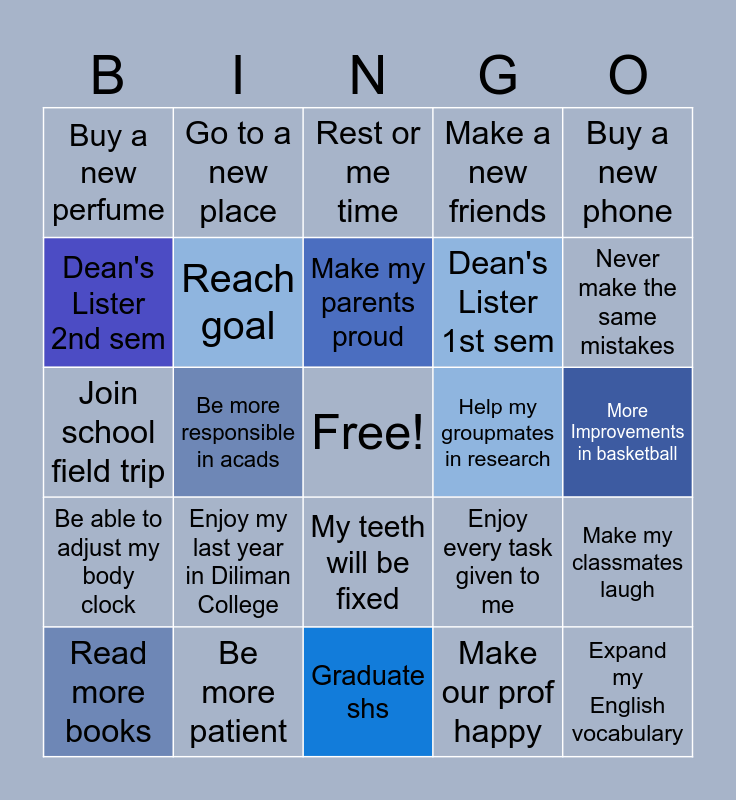 This bingo card has a free space and 24 words: Read more books, Enjoy my last year in Diliman College, Make my parents proud, Make our prof happy, Buy a new phone, Buy a new perfume, Go to a new place, Rest or me time, Help my groupmates in research, More Improvements in basketball, Join school field trip, Reach goal, Enjoy every task given to me, Make my classmates laugh, Dean's Lister 2nd sem, Be more patient, Graduate shs, Make a new friends, Never make the same mistakes, Be able to adjust my body clock, Be more responsible in acads, My teeth will be fixed, Dean's Lister 1st sem and Expand my English vocabulary.