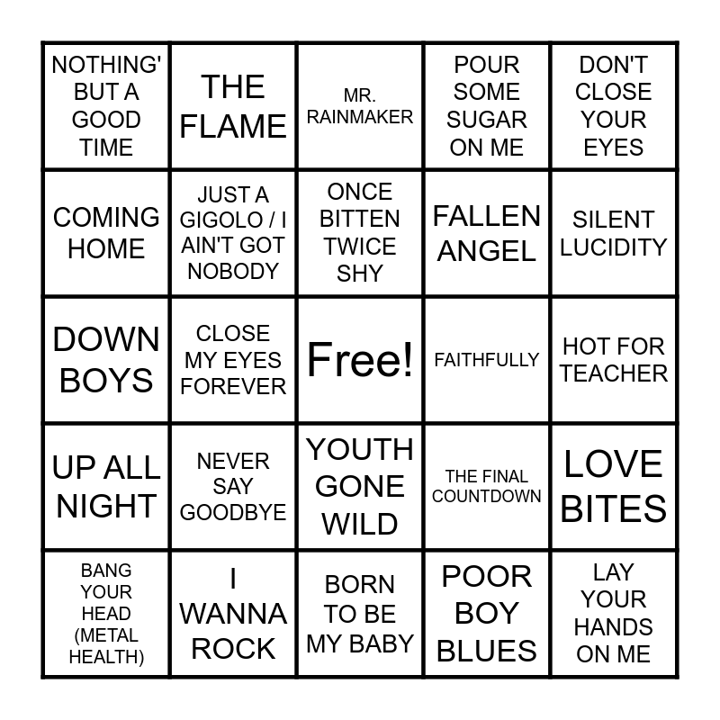 This bingo card has a free space and 46 words: WAIT FOR YOU, LAY YOUR HANDS ON ME, BAD MEDICINE, BORN TO BE MY BABY, NEVER SAY GOODBYE, GIRLSCHOOL, THE FLAME, DON'T KNOW WHAT YOU GOT (TIL IT'S GONE), COMING HOME, HIGH ENOUGH, JUST A GIGOLO / I AIN'T GOT NOBODY, POUR SOME SUGAR ON ME, LOVE BITES, THE FINAL COUNTDOWN, LOVE OF A LIFETIME, SAVE YOUR LOVE, ONCE BITTEN TWICE SHY, FAITHFULLY, FOREVER, DON'T CLOSE YOUR EYES, CLOSE MY EYES FOREVER, POOR BOY BLUES, NOTHING' BUT A GOOD TIME, FALLEN ANGEL, I DON'T BELIEVE IN LOVE, SILENT LUCIDITY, BANG YOUR HEAD (METAL HEALTH), LOVE IS ON THE WAY, YOUTH GONE WILD, UP ALL NIGHT, FLY TO THE ANGELS, I'LL NEVER LET YOU GO, SIGNS, LOVE SONG, WE'RE NOT GONNA TAKE IT, I WANNA ROCK, HOT FOR TEACHER, DREAMS, BEST OF BOTH WORLDS, POUNDCAKE, UNCLE TOM'S CABIN, MR. RAINMAKER, DOWN BOYS, RADAR LOVE, HERE I GO AGAIN and HUNGRY.
