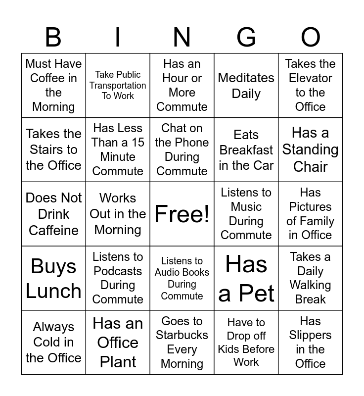 This bingo card has a free space and 24 words: Listens to Podcasts During Commute, Has an Office Plant, Chat on the Phone During Commute, Always Cold in the Office, Takes the Elevator to the Office, Must Have Coffee in the Morning, Takes the Stairs to the Office, Take Public Transportation To Work, Listens to Music During Commute, Listens to Audio Books During Commute, Eats Breakfast in the Car, Does Not Drink Caffeine, Has a Pet, Takes a Daily Walking Break, Has Less Than a 15 Minute Commute, Have to Drop off Kids Before Work, Has Pictures of Family in Office, Has an Hour or More Commute, Has a Standing Chair, Works Out in the Morning, Has Slippers in the Office, Buys Lunch, Meditates Daily and Goes to Starbucks Every Morning.