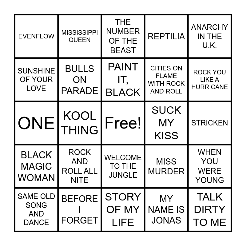 This bingo card has a free space and 47 words: SLOW RIDE, TALK DIRTY TO ME, HIT ME WITH YOUR BEST SHOT, STORY OF MY LIFE, ROCK AND ROLL ALL NITE, SABOTAGE, MISSISSIPPI QUEEN, SCHOOL'S OUT, SUNSHINE OF YOUR LOVE, BARRACUDA, BULLS ON PARADE, REPTILIA, WHEN YOU WERE YOUNG, MISS MURDER, THE SEEKER, LAY DOWN, PAINT IT, BLACK, SUCK MY KISS, PARANOID, ANARCHY IN THE U.K., KOOL THING, MY NAME IS JONAS, EVENFLOW, CITIES ON FLAME WITH ROCK AND ROLL, HOLIDAY IN CAMBODIA, ROCK YOU LIKE A HURRICANE, SAME OLD SONG AND DANCE, LA GRANGE, WELCOME TO THE JUNGLE, BLACK MAGIC WOMAN, CHERUB ROCK, BLACK SUNSHINE, THE METAL, PRIDE AND JOY, MONSTERS, BEFORE I FORGET, STRICKEN, 3's AND 7's, KNIGHTS OF CYDONIA, CULT OF PERSONALITY, CLIFFS OF DOVER, THE NUMBER OF THE BEAST, ONE, THE DEVIL WENT DOWN TO GEORGIA, THROUGH THE FIRE AND FLAMES, AVALANCHA and CLOSER.
