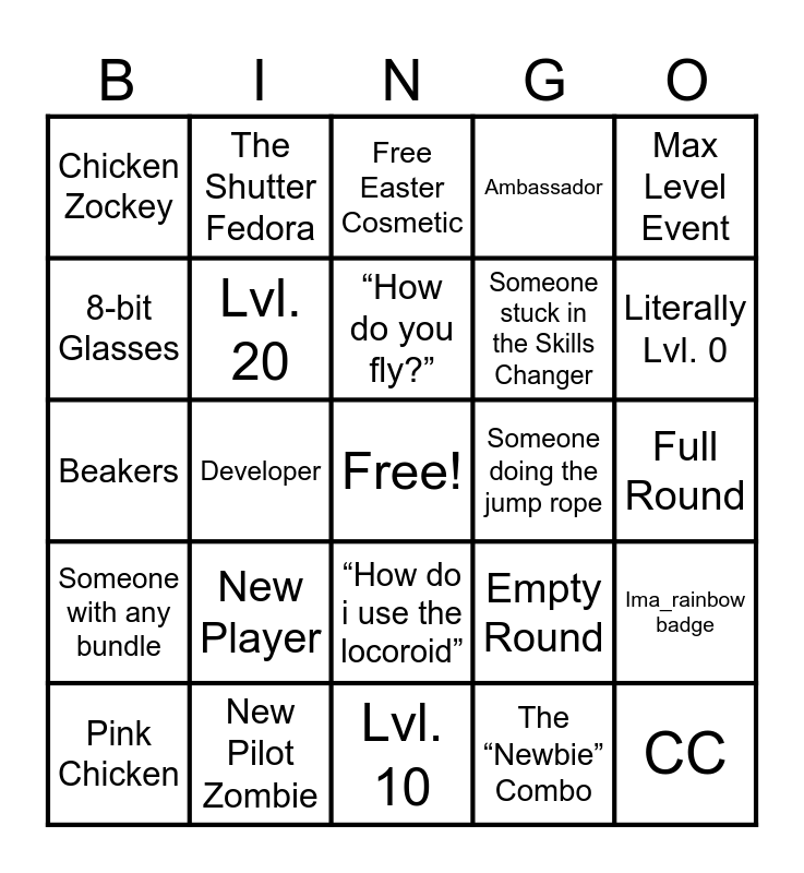 This bingo card has a free space and 24 words: New Player, New Pilot Zombie, “How do you fly?”, Pink Chicken, Max Level Event, Chicken Zockey, 8-bit Glasses, The Shutter Fedora, Someone doing the jump rope, “How do i use the locoroid”, Someone stuck in the Skills Changer, Beakers, Empty Round, Ima_rainbow badge, Lvl. 20, The “Newbie” Combo, Full Round, Free Easter Cosmetic, Literally Lvl. 0, Developer, CC, Someone with any bundle, Ambassador and Lvl. 10.