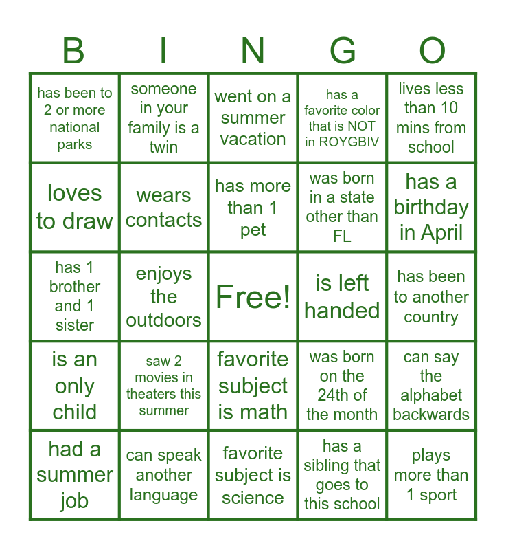This bingo card has a free space and 24 words: saw 2 movies in theaters this summer, can speak another language, has more than 1 pet, had a summer job, lives less than 10 mins from school, has been to 2 or more national parks, loves to draw, someone in your family is a twin, is left handed, favorite subject is math, was born in a state other than FL, has 1 brother and 1 sister, was born on the 24th of the month, can say the alphabet backwards, wears contacts, has a sibling that goes to this school, has been to another country, went on a summer vacation, has a birthday in April, enjoys the outdoors, plays more than 1 sport, is an only child, has a favorite color that is NOT in ROYGBIV and favorite subject is science.