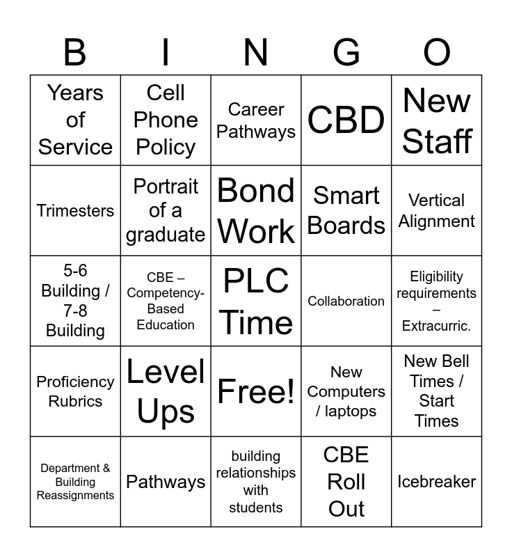 This bingo card has 26 words: Free!, CBE Roll Out, Bond Work, Pathways, New Staff, Years of Service, Trimesters, Cell Phone Policy, Eligibility requirements – Extracurric., New Computers / laptops, Smart Boards, 5-6 Building / 7-8 Building, New Bell Times / Start Times, Department & Building Reassignments, CBE – Competency-Based Education, Competency-Based Grading, CBD, Proficiency Rubrics, Career Pathways, PLC Time, Vertical Alignment, building relationships with students, Collaboration, Level Ups, Portrait of a graduate and Icebreaker.