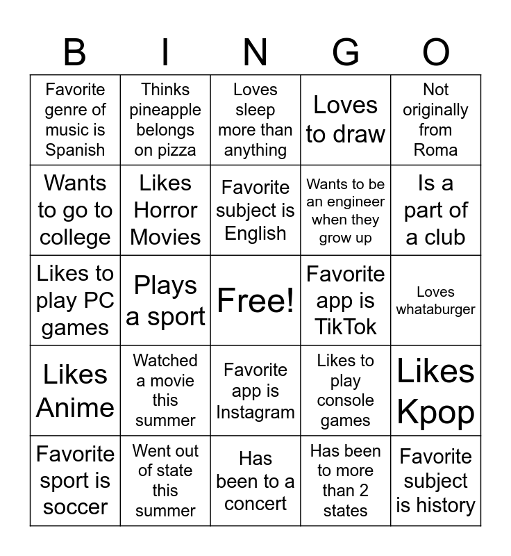This bingo card has a free space and 24 words: Watched a movie this summer, Went out of state this summer, Favorite subject is English, Favorite sport is soccer, Not originally from Roma, Favorite genre of music is Spanish, Wants to go to college, Thinks pineapple belongs on pizza, Favorite app is TikTok, Favorite app is Instagram, Wants to be an engineer when they grow up, Likes to play PC games, Likes to play console games, Likes Kpop, Likes Horror Movies, Has been to more than 2 states, Loves whataburger, Loves sleep more than anything, Is a part of a club, Plays a sport, Favorite subject is history, Likes Anime, Loves to draw and Has been to a concert.
