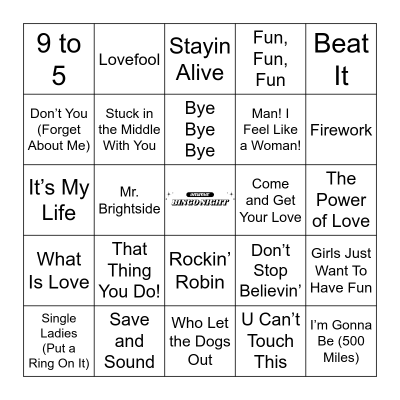 This bingo card has a free space and 50 words: In the Summertime, I’m Gonna Be (500 Miles), I Want Candy, Who Let the Dogs Out, That Thing You Do!, All Star, Lovefool, I’ll Be There For You, Don’t You (Forget About Me), Wagon Wheel, Stuck in the Middle With You, Fun, Fun, Fun, Girls Just Want To Have Fun, Don’t Stop Believin’, Under Pressure, Another One Bites the Dust, Bye Bye Bye, Come and Get Your Love, Jack and Diane, Beat It, Mr. Brightside, U Can’t Touch This, 9 to 5, Man! I Feel Like a Woman!, I Can See Clearly Now, Can’t Stop the Feeling!, Firework, Shake It Off, Stayin Alive, Rockin’ Robin, Good Golly Miss Molly, Yakety Yak, Thunder, Shut Up And Dance, Save and Sound, I Love Rock ’N Roll, Ticket to Ride, Any Way You Want It, The Way You Make Me Feel, The Power of Love, Let’s Dance, Old Time Rock & Roll, Dreams, Bad Moon Rising, Single Ladies (Put a Ring On It), It’s My Life, Larger Than Life, When Doves Cry, What Is Love and The Boys Are Back In Town.