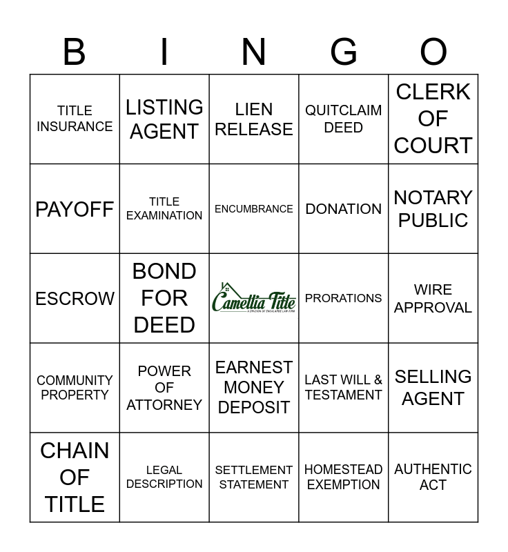 This bingo card has a free space and 24 words: POWER OF ATTORNEY, LEGAL DESCRIPTION, ENCUMBRANCE, CHAIN OF TITLE, CLERK OF COURT, TITLE INSURANCE, PAYOFF, LISTING AGENT, PRORATIONS, EARNEST MONEY DEPOSIT, DONATION, ESCROW, LAST WILL & TESTAMENT, SELLING AGENT, TITLE EXAMINATION, HOMESTEAD EXEMPTION, WIRE APPROVAL, LIEN RELEASE, NOTARY PUBLIC, BOND FOR DEED, AUTHENTIC ACT, COMMUNITY PROPERTY, QUITCLAIM DEED and SETTLEMENT STATEMENT.