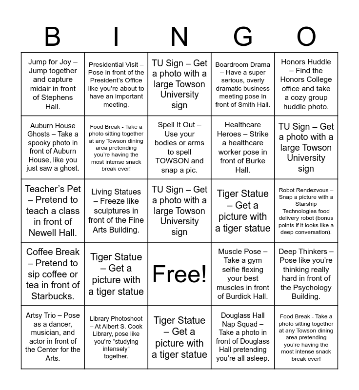 This bingo card has 26 words: Free!, Douglass Hall Nap Squad – Take a photo in front of Douglass Hall pretending you’re all asleep., Spell It Out – Use your bodies or arms to spell TOWSON and snap a pic., Library Photoshoot – At Albert S. Cook Library, pose like you’re “studying intensely” together., Honors Huddle – Find the Honors College office and take a cozy group huddle photo., Jump for Joy – Jump together and capture midair in front of Stephens Hall., Auburn House Ghosts – Take a spooky photo in front of Auburn House, like you just saw a ghost., Presidential Visit – Pose in front of the President’s Office like you’re about to have an important meeting., Robot Rendezvous – Snap a picture with a Starship Technologies food delivery robot (bonus points if it looks like a deep conversation)., Muscle Pose – Take a gym selfie flexing your best muscles in front of Burdick Hall., Healthcare Heroes – Strike a healthcare worker pose in front of Burke Hall., Teacher’s Pet – Pretend to teach a class in front of Newell Hall., Deep Thinkers – Pose like you’re thinking really hard in front of the Psychology Building., Artsy Trio – Pose as a dancer, musician, and actor in front of the Center for the Arts., Living Statues – Freeze like sculptures in front of the Fine Arts Building., Philosopher’s Corner – Give your best philosopher’s pose in front of the Liberal Arts Building., Boardroom Drama – Have a super serious, overly dramatic business meeting pose in front of Smith Hall., Coffee Break – Pretend to sip coffee or tea in front of Starbucks., TU Sign – Get a photo with a large Towson University sign, TU Sign – Get a photo with a large Towson University sign, TU Sign – Get a photo with a large Towson University sign, Tiger Statue – Get a picture with a tiger statue, Tiger Statue – Get a picture with a tiger statue, Tiger Statue – Get a picture with a tiger statue, Food Break - Take a photo sitting together at any Towson dining area pretending you’re having the most intense snack break ever! and Food Break - Take a photo sitting together at any Towson dining area pretending you’re having the most intense snack break ever!.