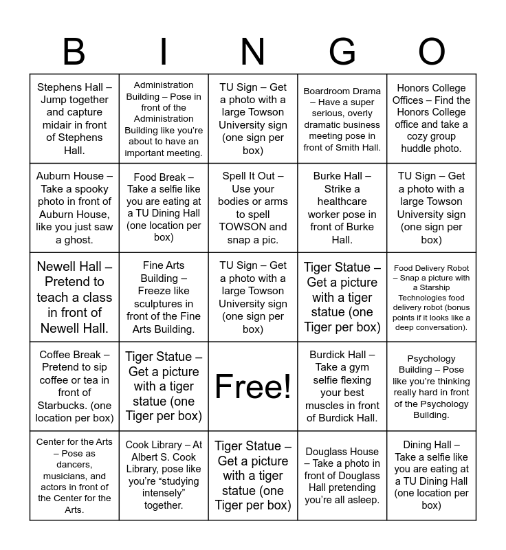 This bingo card has 26 words: Free!, Douglass House – Take a photo in front of Douglass Hall pretending you’re all asleep., Spell It Out – Use your bodies or arms to spell TOWSON and snap a pic., Cook Library – At Albert S. Cook Library, pose like you’re “studying intensely” together., Honors College Offices – Find the Honors College office and take a cozy group huddle photo., Stephens Hall – Jump together and capture midair in front of Stephens Hall., Auburn House – Take a spooky photo in front of Auburn House, like you just saw a ghost., Administration Building – Pose in front of the Administration Building like you’re about to have an important meeting., Food Delivery Robot – Snap a picture with a Starship Technologies food delivery robot (bonus points if it looks like a deep conversation)., Burdick Hall – Take a gym selfie flexing your best muscles in front of Burdick Hall., Burke Hall – Strike a healthcare worker pose in front of Burke Hall., Newell Hall – Pretend to teach a class in front of Newell Hall., Psychology Building – Pose like you’re thinking really hard in front of the Psychology Building., Center for the Arts – Pose as dancers, musicians, and actors in front of the Center for the Arts., Fine Arts Building – Freeze like sculptures in front of the Fine Arts Building., Liberal Arts Building- Give your best philosopher’s pose in front of the Liberal Arts Building., Boardroom Drama – Have a super serious, overly dramatic business meeting pose in front of Smith Hall., Coffee Break – Pretend to sip coffee or tea in front of Starbucks. (one location per box), TU Sign – Get a photo with a large Towson University sign (one sign per box), TU Sign – Get a photo with a large Towson University sign (one sign per box), TU Sign – Get a photo with a large Towson University sign (one sign per box), Tiger Statue – Get a picture with a tiger statue (one Tiger per box), Tiger Statue – Get a picture with a tiger statue (one Tiger per box), Tiger Statue – Get a picture with a tiger statue (one Tiger per box), Food Break – Take a selfie like you are eating at a TU Dining Hall (one location per box) and Dining Hall – Take a selfie like you are eating at a TU Dining Hall (one location per box).