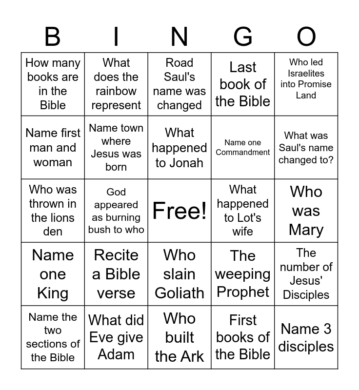 This bingo card has a free space and 25 words: Recite a Bible verse, Who built the Ark, What happened to Jonah, Name the two sections of the Bible, Who led Israelites into Promise Land, How many books are in the Bible, Name first man and woman, What does the rainbow represent, What happened to Lot's wife, Who slain Goliath, Name one Commandment, Who was thrown in the lions den, The weeping Prophet, The number of Jesus' Disciples, Name town where Jesus was born, Fed the crowd with two fish, Who was Mary, Road Saul's name was changed, What was Saul's name changed to?, God appeared as burning bush to who, Name 3 disciples, What did Eve give Adam, Name one King, Last book of the Bible and First books of the Bible.