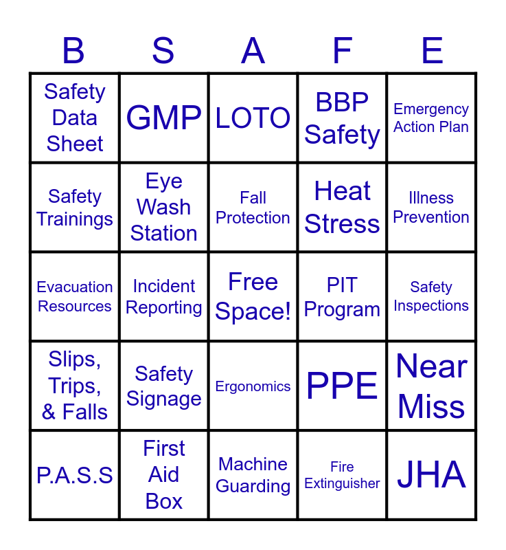This bingo card has a free space and 24 words: Safety Signage, First Aid Box, Fall Protection, P.A.S.S, Emergency Action Plan, Safety Data Sheet, Safety Trainings, GMP, PIT Program, Ergonomics, Heat Stress, Evacuation Resources, PPE, Near Miss, Eye Wash Station, Fire Extinguisher, Safety Inspections, LOTO, Illness Prevention, Incident Reporting, JHA, Slips, Trips, & Falls, BBP Safety and Machine Guarding.