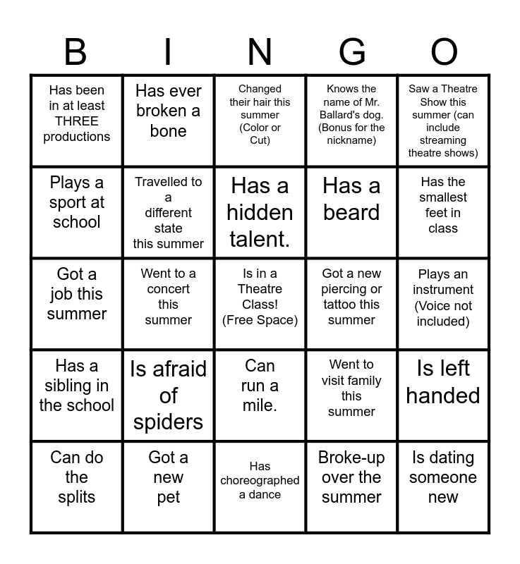 This bingo card has a free space and 24 words: Is afraid of spiders, Got a new pet, Has a hidden talent., Can do the splits, Saw a Theatre Show this summer (can include streaming theatre shows), Has been in at least THREE productions, Plays a sport at school, Has ever broken a bone, Got a new piercing or tattoo this summer, Can run a mile., Has a beard, Got a job this summer, Went to visit family this summer, Is left handed, Travelled to a different state this summer, Broke-up over the summer, Plays an instrument (Voice not included), Changed their hair this summer (Color or Cut), Has the smallest feet in class, Went to a concert this summer, Is dating someone new, Has a sibling in the school, Knows the name of Mr. Ballard's dog. (Bonus for the nickname) and Has choreographed a dance.