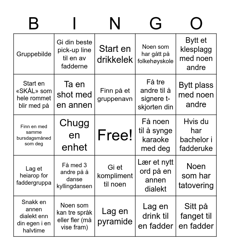 This bingo card has a free space and 24 words: Få med 3 andre på å danse kyllingdansen, Noen som kan tre språk eller fler (må vise fram), Finn på et gruppenavn, Snakk en annen dialekt enn din egen i en halvtime, Bytt et klesplagg med noen andre, Gruppebilde, Start en «SKÅL» som hele rommet blir med på, Gi din beste pick-up line til en av fadderne, Få noen til å synge karaoke med deg, Gi et kompliment til noen, Få tre andre til å signere t-skjorten din, Finn en med samme bursdagsmåned som deg, Lær et nytt ord på en annen dialekt, Noen som har tatovering, Ta en shot med en annen, Lag en drink til en fadder, Hvis du har bachelor i fadderuke, Start en drikkelek, Bytt plass med noen andre, Chugg en enhet, Sitt på fanget til en fadder, Lag et heiarop for faddergruppa, Noen som har gått på folkehøyskole and Lag en pyramide.