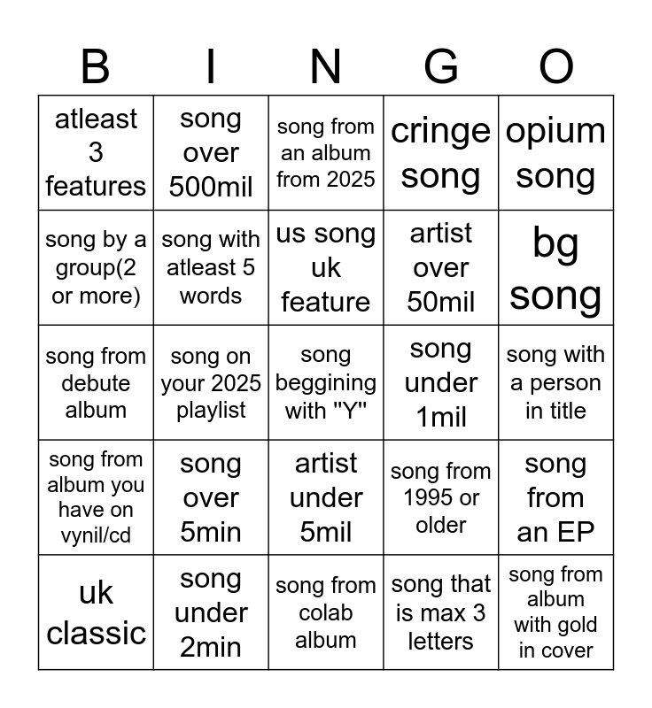 This bingo card has a free space and 24 words: song over 5min, song under 2min, us song uk feature, uk classic, opium song, atleast 3 features, song by a group(2 or more), song over 500mil, song under 1mil, artist under 5mil, artist over 50mil, song from debute album, song from 1995 or older, song from an EP, song with atleast 5 words, song that is max 3 letters, song with a person in title, song from an album from 2025, bg song, song on your 2025 playlist, song from album with gold in cover, song from album you have on vynil/cd, cringe song and song from colab album.