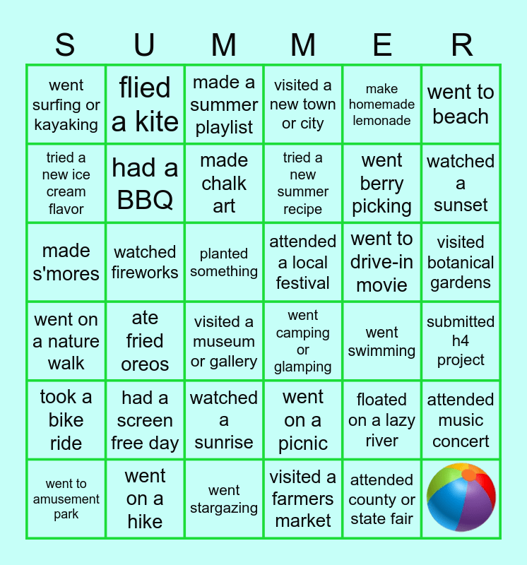 This bingo card has 1 images and 35 words: went on a picnic, watched a sunrise, visited a farmers market, tried a new ice cream flavor, went on a nature walk, attended a local festival, had a BBQ, went stargazing, make homemade lemonade, floated on a lazy river, watched a sunset, visited a new town or city, attended music concert, watched fireworks, tried a new summer recipe, went surfing or kayaking, took a bike ride, went to drive-in movie, made s'mores, made a summer playlist, planted something, ate fried oreos, went camping or glamping, visited a museum or gallery, went swimming, flied a kite, went berry picking, went on a hike, made chalk art, went to beach, went to amusement park, submitted h4 project, visited botanical gardens, had a screen free day and attended county or state fair.