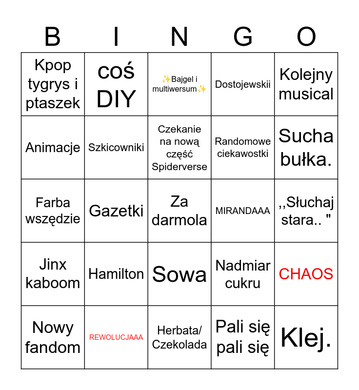 This bingo card has a free space and 24 words: Nowy fandom, Hamilton, Czekanie na nową część Spiderverse, Pali się pali się, Kolejny musical, Kpop tygrys i ptaszek, coś DIY, ✨️Bajgel i multiwersum✨️, MIRANDAAA, ,,Słuchaj stara.. ", Farba wszędzie, Szkicowniki, Nadmiar cukru, CHAOS, Animacje, REWOLUCJAAA, Herbata/ Czekolada, Dostojewskii, Sucha bułka., Jinx kaboom, Gazetki, Sowa, Randomowe ciekawostki and Klej..