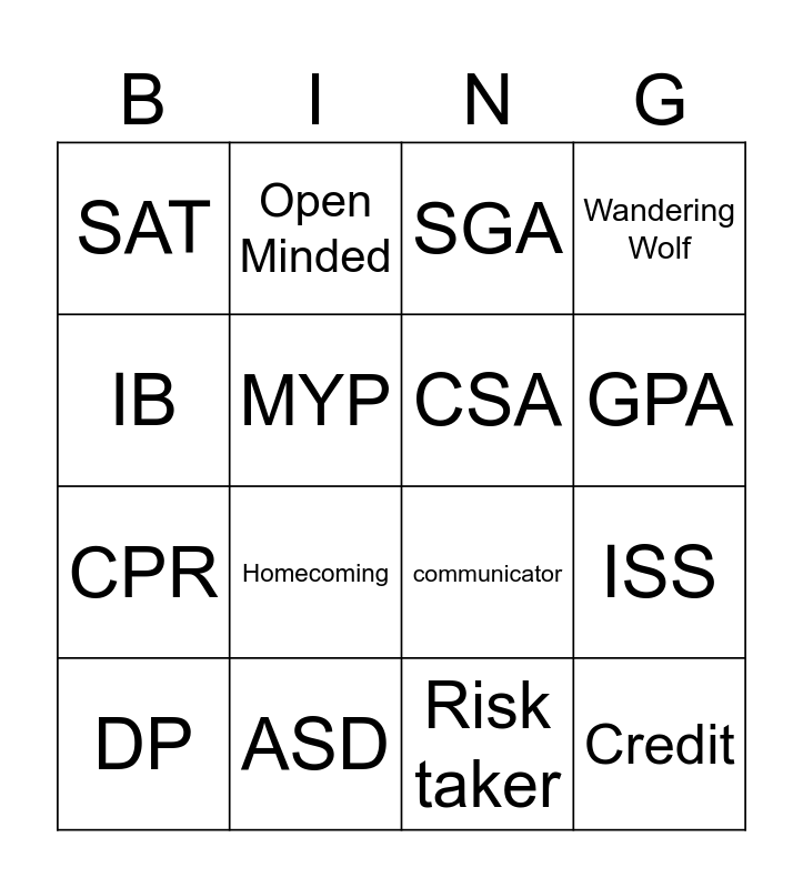 This bingo card has 16 words: ASD, ISS, SGA, SAT, CPR, Open Minded, communicator, Risk taker, IB, MYP, DP, Wandering Wolf, Homecoming, GPA, CSA and Credit.