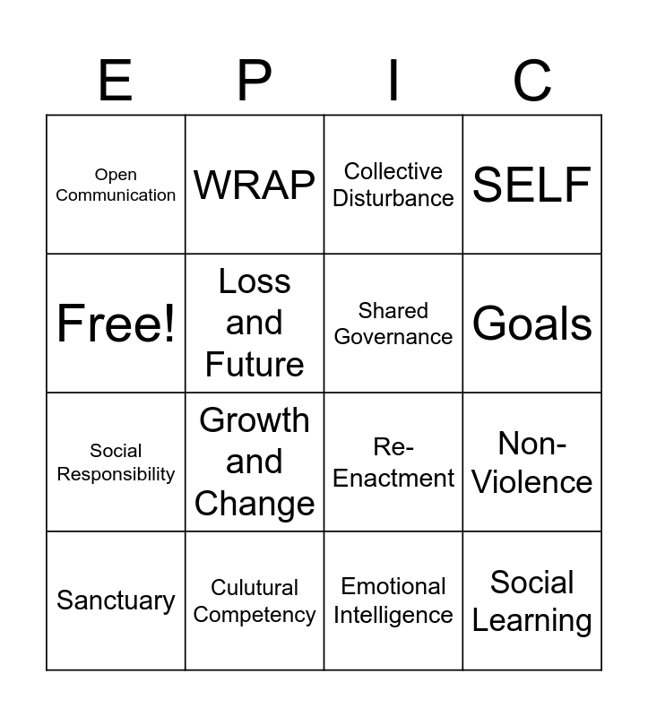 This bingo card has 16 words: Culutural Competency, Non-Violence, Collective Disturbance, Open Communication, Social Responsibility, WRAP, Re-Enactment, Emotional Intelligence, Free!, Loss and Future, Sanctuary, SELF, Growth and Change, Goals, Shared Governance and Social Learning.