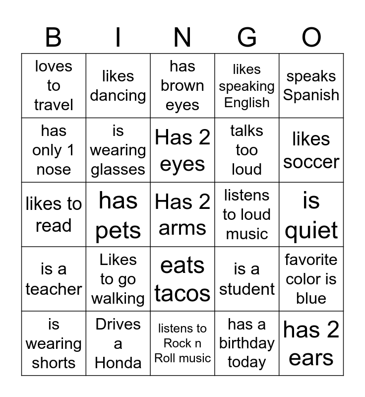 This bingo card has a free space and 24 words: Likes to go walking, Drives a Honda, Has 2 eyes, is wearing shorts, speaks Spanish, loves to travel, has only 1 nose, likes dancing, listens to loud music, eats tacos, talks too loud, likes to read, is a student, favorite color is blue, is wearing glasses, has a birthday today, is quiet, has brown eyes, likes soccer, has pets, has 2 ears, is a teacher, likes speaking English and listens to Rock n Roll music.
