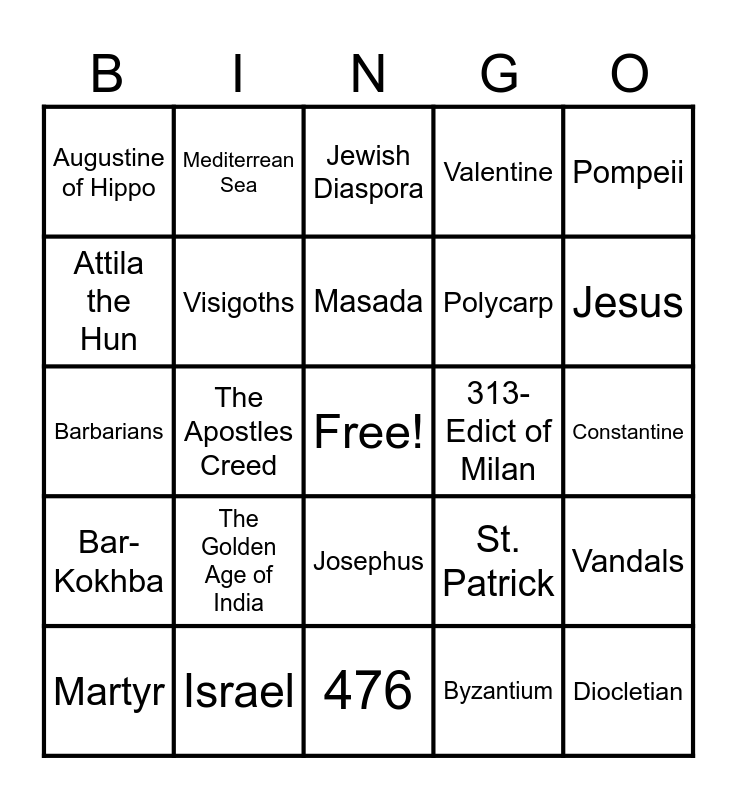 This bingo card has a free space and 39 words: Nero, Pentecost, Paul, Visigoths, Martyr, Josephus, Masada, Dead Sea Scrolls, Pompeii, Bar-Kokhba, The Apostles Creed, Valentine, Diocletian, Constantine, 313- Edict of Milan, The Golden Age of India, The Maya, Augustine of Hippo, Jerome's Vulgate, St. Patrick, Attila the Hun, 476, Polycarp, Jesus, Stephen, Gentiles, Tarsus, Barnabas, Mars Hill, Mediterrean Sea, Chariot Racing, Scapegoat, Jewish Diaspora, Israel, Byzantium, Hinduism, Vandals, Barbarians and Gaul.