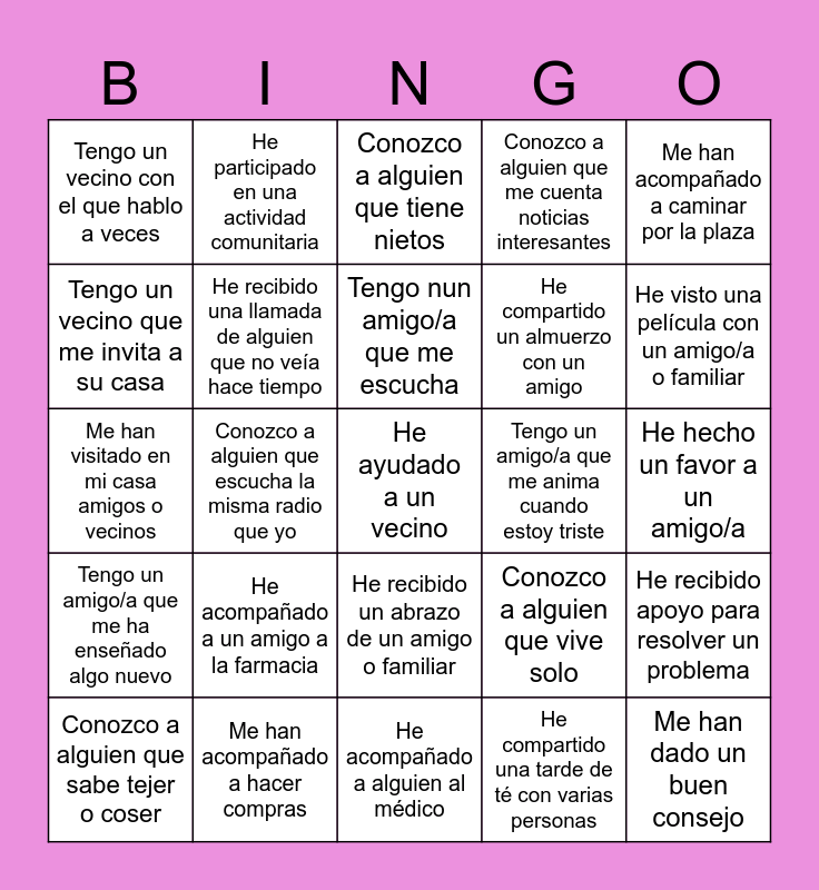 This bingo card has 25 words: He acompañado a un amigo a la farmacia, He acompañado a alguien al médico, Tengo nun amigo/a que me escucha, Conozco a alguien que sabe tejer o coser, Me han acompañado a caminar por la plaza, Tengo un vecino con el que hablo a veces, Tengo un vecino que me invita a su casa, He participado en una actividad comunitaria, Tengo un amigo/a que me anima cuando estoy triste, He recibido un abrazo de un amigo o familiar, He compartido un almuerzo con un amigo, Me han visitado en mi casa amigos o vecinos, Conozco a alguien que vive solo, He recibido apoyo para resolver un problema, He recibido una llamada de alguien que no veía hace tiempo, Me han dado un buen consejo, He hecho un favor a un amigo/a, Conozco a alguien que tiene nietos, He visto una película con un amigo/a o familiar, Conozco a alguien que escucha la misma radio que yo, He ayudado a un vecino, Me han acompañado a hacer compras, Tengo un amigo/a que me ha enseñado algo nuevo, Conozco a alguien que me cuenta noticias interesantes and He compartido una tarde de té con varias personas.