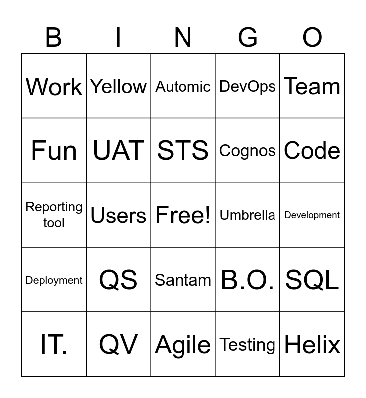 This bingo card has a free space and 24 words: QS, QV, STS, IT., Team, Work, Fun, Yellow, Umbrella, Santam, Cognos, Reporting tool, B.O., SQL, UAT, Testing, Development, Automic, Code, Users, Helix, Deployment, DevOps and Agile.