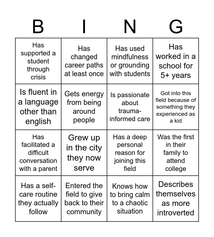This bingo card has 16 words: Entered the field to give back to their community, Was the first in their family to attend college, Has used mindfulness or grounding with students, Has supported a student through crisis, Has facilitated a difficult conversation with a parent, Has changed career paths at least once, Has a deep personal reason for joining this field, Knows how to bring calm to a chaotic situation, Is fluent in a language other than english, Gets energy from being around people, Has a self-care routine they actually follow, Has worked in a school for 5+ years, Grew up in the city they now serve, Got into this field because of something they experienced as a kid, Is passionate about trauma-informed care and Describes themselves as more introverted.