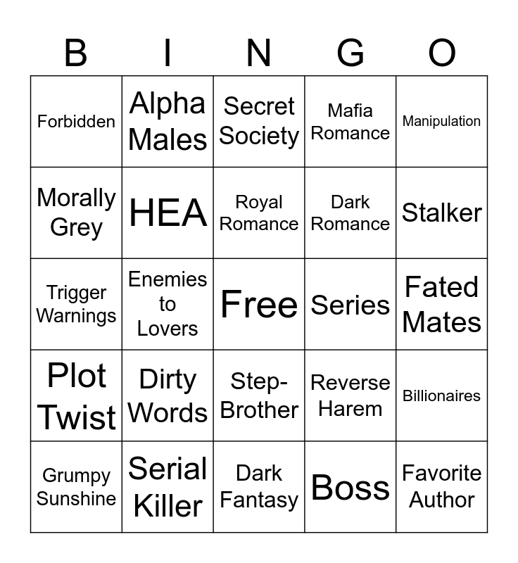 This bingo card has a free space and 50 words: Spicy Books, Favorite Author, Shifters, Dark Fantasy, Dirty Words, Revenge, Alpha Males, Friends to Lovers, Morally Grey, Paranormal, HEA, Mafia Romance, Billionaires, Reverse Harem, Knife Play, Touch Her & Die, Royal Romance, Series, Bully, Manipulation, Enemies to Lovers, Boss, Forbidden, Dark Romance, Book Boyfriend, Age Gap, Stalker, Masked Man, Secret Society, Step-Brother, Betrayal, Slow Burn, Tragic Backstory, Captive, Serial Killer, Taboo, Secret Identity, Ex Prisoner, Motorcycle, Fated Mates, Monster, Kinks, New Book, Wish You Could Read for the 1st Time Again, Grumpy Sunshine, Trigger Warnings, Like a Good Girl, Kindle Audio Print, Plot Twist and Palate Cleanser.