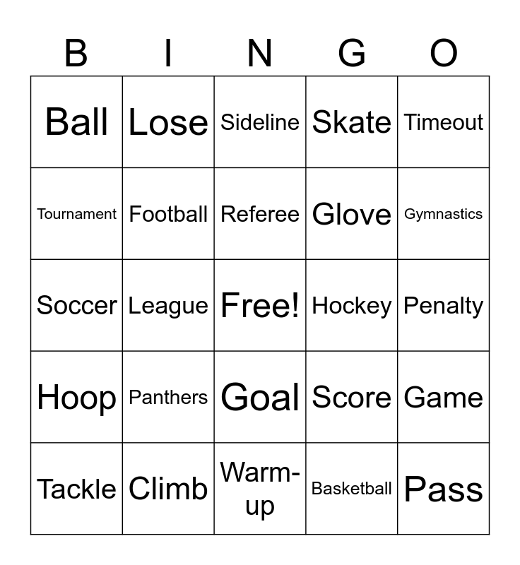 This bingo card has a free space and 66 words: Athlete, Coach, Team, Game, Score, Win, Lose, Draw, Referee, Umpire, Goal, Point, Penalty, Timeout, Overtime, Tournament, League, Ball, Bat, Glove, Panthers, Hoop, Skate, Puck, Eagles, Vest, Throw, Catch, Pass, Dribble, Tackle, Block, Swing, Serve, Score, Climb, Stretch, Soccer, Basketball, Baseball, Football, Golf, Hockey, Volleyball, Swimming, Track, Gymnastics, Wrestling, Boxing, Cricket, Lacrosse, Trophy, NFL, Stadium, Field, Court, NBA, Bench, Sideline, Warm-up, Practice, Fitness, Speed, Victory, Defeat and Sportsmanship.