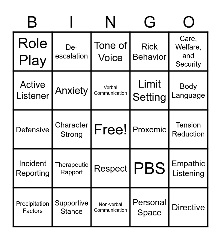 This bingo card has a free space and 24 words: Therapeutic Rapport, Supportive Stance, Verbal Communication, Precipitation Factors, Care, Welfare, and Security, Role Play, Active Listener, De-escalation, Proxemic, Respect, Limit Setting, Defensive, PBS, Empathic Listening, Anxiety, Personal Space, Tension Reduction, Tone of Voice, Body Language, Character Strong, Directive, Incident Reporting, Rick Behavior and Non-verbal Communication.