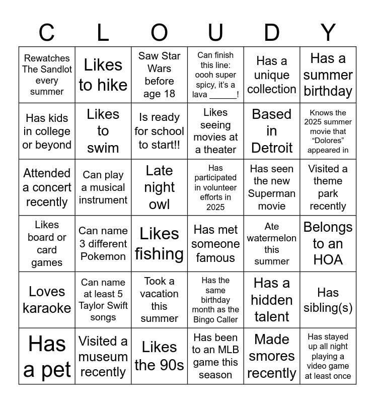 This bingo card has 48 words: Likes to cook, Attended a concert recently, Went to the beach recently, Ate watermelon this summer, Has seen the new Superman movie, Has the same birthday month as the Bingo Caller, Likes to hike, About to add a new human to the family soon (YAY!), Has a summer birthday, Visited a museum recently, Has kids in college or beyond, Can finish this line: oooh super spicy, it’s a lava ______!, Can name 3 different Pokemon, Likes board or card games, Has stayed up all night playing a video game at least once, Took a vacation this summer, Likes to swim, Can play a musical instrument, Free!, Has a unique collection, Knows the 2025 summer movie that “Dolores” appeared in, Belongs to an HOA, Rewatches The Sandlot every summer, Is ready for school to start!!, Has been outside home country, Likes seeing movies at a theater, Likes fishing, Ran a race in the past year, Visited a theme park recently, Has participated in volunteer efforts in 2025, Read at least 1 book in the last 3 months, Can name at least 5 Taylor Swift songs, Made smores recently, Likes icecream / popsicles, Has met someone famous, Likes the 90s, Has been to an MLB game this season, Late night owl, Has a pet, Can speak multiple languages fluently, Has a hidden talent, Loves karaoke, Saw Star Wars before age 18, Based in Cincy, Based in Detroit, Not based in Cincy or Detroit, Has sibling(s) and Morning person.