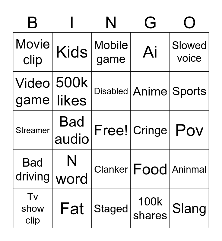 This bingo card has a free space and 24 words: N word, Fat, Disabled, Tv show clip, Slowed voice, Movie clip, Video game, Kids, Cringe, Clanker, Anime, Streamer, Food, Aninmal, 500k likes, 100k shares, Pov, Mobile game, Sports, Bad audio, Slang, Bad driving, Ai and Staged.