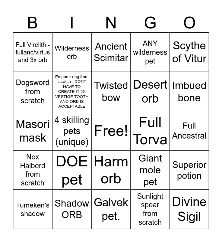 This bingo card has a free space and 24 words: DOE pet, Shadow ORB, Twisted bow, Tumeken's shadow, Scythe of Vitur, Full Virelith - fullanc/virtus and 3x orb, Dogsword from scratch, Wilderness orb, Full Torva, Harm orb, Desert orb, Masori mask, Giant mole pet, Superior potion, Emporer ring from scratch - DONT HAVE TO CREATE IT 3X VESTIGE TOOTH AND ORB IS ACCEPTABLE, Sunlight spear from scratch, Full Ancestral, Ancient Scimitar, Imbued bone, 4 skilling pets (unique), Divine Sigil, Nox Halberd from scratch, ANY wilderness pet and Galvek pet..