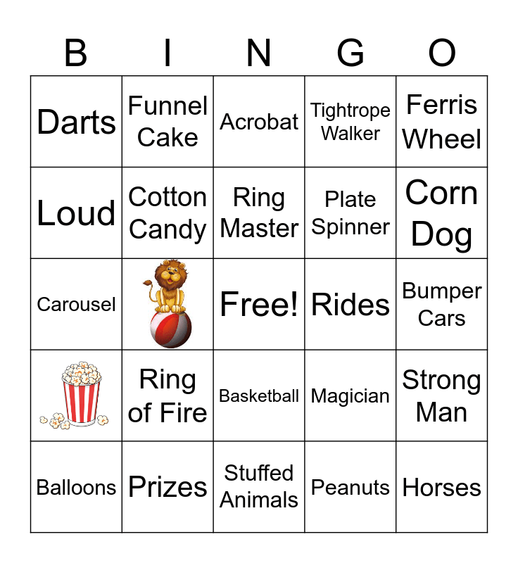 This bingo card has 5 images, a free space and 28 words: Cotton Candy, Ferris Wheel, Balloons, Funnel Cake, Ring Toss, Ring Master, Acrobat, Juggler, Tickets, Rides, Corn Dog, Prizes, Carousel, Ring of Fire, Magician, Basketball, Games, Darts, Bumper Cars, Stuffed Animals, Horses, Tightrope Walker, Plate Spinner, Loud, Strong Man, Bearded Lady, Peanuts and Elephant.