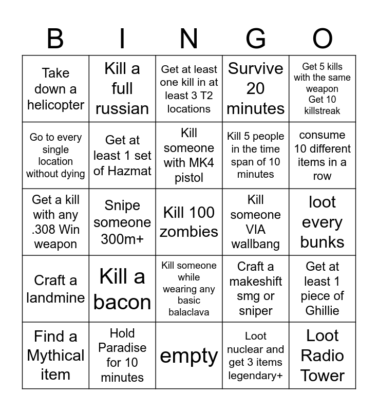 This bingo card has a free space and 24 words: Kill a bacon, Hold Paradise for 10 minutes, Kill someone with MK4 pistol, Find a Mythical item, Get 5 kills with the same weapon Get 10 killstreak, Take down a helicopter, Go to every single location without dying, Kill a full russian, Kill someone VIA wallbang, Kill someone while wearing any basic balaclava, Kill 5 people in the time span of 10 minutes, Get a kill with any .308 Win weapon, Craft a makeshift smg or sniper, Get at least 1 piece of Ghillie, Get at least 1 set of Hazmat, Loot nuclear and get 3 items legendary+, loot every bunks, Get at least one kill in at least 3 T2 locations, consume 10 different items in a row, Snipe someone 300m+, Loot Radio Tower, Craft a landmine, Survive 20 minutes and empty.