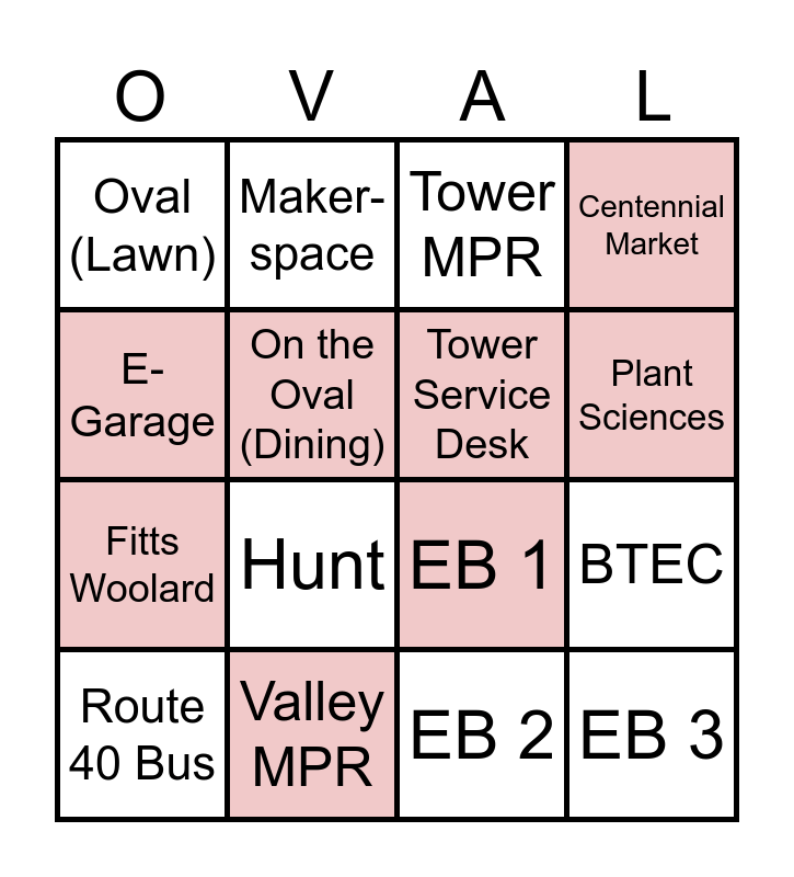 This bingo card has 16 words: Route 40 Bus, Valley MPR, Tower MPR, Centennial Market, E-Garage, Maker-space, EB 1, BTEC, Oval (Lawn), On the Oval (Dining), EB 2, Plant Sciences, Fitts Woolard, Hunt, Tower Service Desk and EB 3.