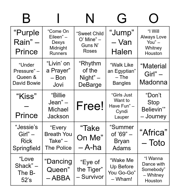 This bingo card has a free space and 30 words: “Dancing Queen” – ABBA, “Bohemian Rhapsody” – Queen, “Billie Jean” – Michael Jackson, “Like a Virgin” – Madonna, “Purple Rain” – Prince, “Sweet Child O’ Mine” – Guns N’ Roses, “Livin’ on a Prayer” – Bon Jovi, “Take On Me” – A-ha, “Girls Just Want to Have Fun” – Cyndi Lauper, “Eye of the Tiger” – Survivor, “Don’t Stop Believin’” – Journey, “I Wanna Dance with Somebody” – Whitney Houston, “Wake Me Up Before You Go-Go” – Wham!, “Thriller” – Michael Jackson, “Material Girl” – Madonna, “Pour Some Sugar on Me” – Def Leppard, “Summer of ’69” – Bryan Adams, “Jessie’s Girl” – Rick Springfield, “Every Breath You Take” – The Police, “I Will Always Love You” – Whitney Houston, “Kiss” – Prince, “Beat It” – Michael Jackson, “Come On Eileen” – Dexys Midnight Runners, “Walk Like an Egyptian” – The Bangles, “Under Pressure” – Queen & David Bowie, “Jump” – Van Halen, “Africa” – Toto, “Love Shack” – The B-52’s, “Rhythm of the Night” – DeBarge and “I’m Too Sexy” – Right Said Fred.