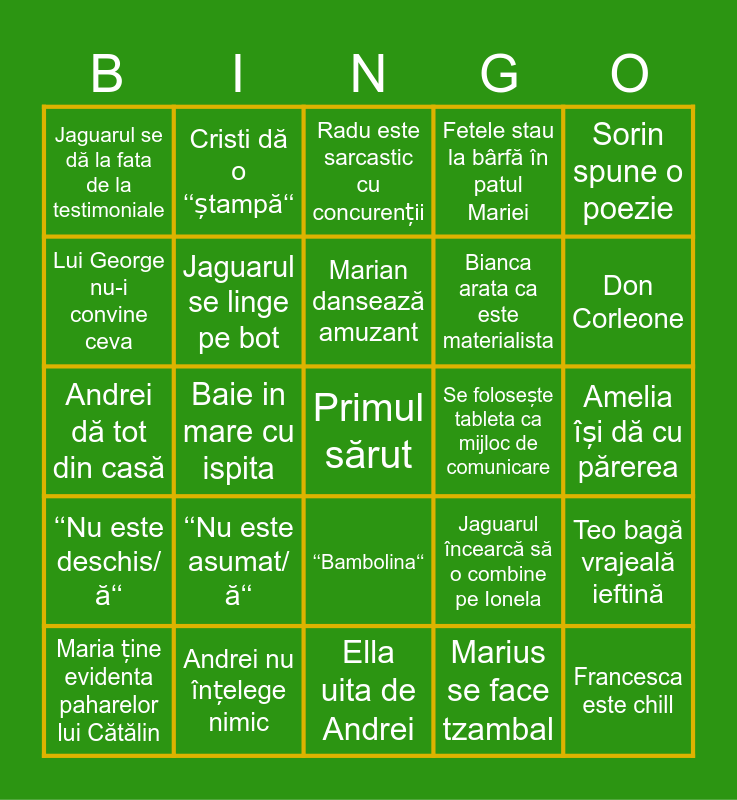 This bingo card has a free space and 24 words: ‘‘Nu este asumat/ă‘‘, Andrei nu înțelege nimic, Marian dansează amuzant, Maria ține evidenta paharelor lui Cătălin, Sorin spune o poezie, Jaguarul se dă la fata de la testimoniale, Lui George nu-i convine ceva, Cristi dă o ‘‘ștampă‘‘, Se folosește tableta ca mijloc de comunicare, ‘‘Bambolina‘‘, Bianca arata ca este materialista, Andrei dă tot din casă, Jaguarul încearcă să o combine pe Ionela, Teo bagă vrajeală ieftină, Jaguarul se linge pe bot, Marius se face tzambal, Amelia își dă cu părerea, Radu este sarcastic cu concurenții, Don Corleone, Baie in mare cu ispita, Francesca este chill, ‘‘Nu este deschis/ă‘‘, Fetele stau la bârfă în patul Mariei and Ella uita de Andrei.
