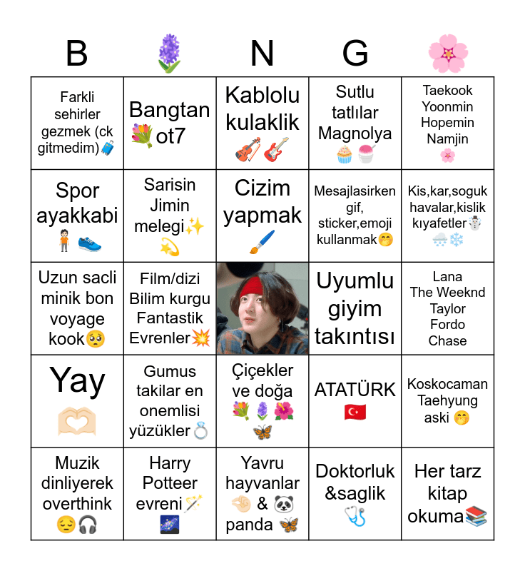 This bingo card has a free space and 24 words: Gumus takilar en onemlisi yüzükler💍, Harry Potteer evreni🪄🌌, Cizim yapmak🖌️, Muzik dinliyerek overthink😔🎧, Taekook Yoonmin Hopemin Namjin 🌸, Farkli sehirler gezmek (ck gitmedim)🧳, Spor ayakkabi 🧍🏻👟, Bangtan 💐ot7, Uyumlu giyim takıntısı, Çiçekler ve doğa 💐🪻🌺🦋, Mesajlasirken gif, sticker,emoji kullanmak🤭, Uzun sacli minik bon voyage kook🥺, ATATÜRK 🇹🇷, Koskocaman Taehyung aski 🤭, Sarisin Jimin melegi✨💫, Doktorluk &saglik 🩺, Lana The Weeknd Taylor Fordo Chase, Kablolu kulaklik🎻🎸, Kis,kar,soguk havalar,kislik kıyafetler☃️🌨️❄️, Film/dizi Bilim kurgu Fantastik Evrenler💥, Her tarz kitap okuma📚, Yay 🫶🏻, Sutlu tatlılar Magnolya🧁🍧 and Yavru hayvanlar🤏🏻 & 🐼 panda 🦋.