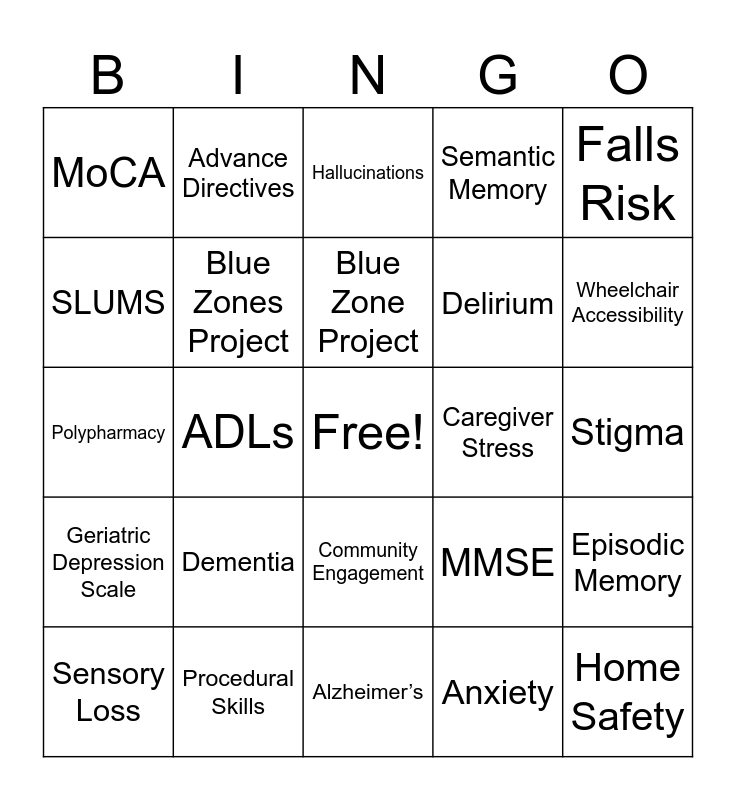 This bingo card has a free space and 25 words: Dementia, Alzheimer’s, Blue Zone Project, Sensory Loss, Falls Risk, MoCA, SLUMS, Advance Directives, Caregiver Stress, Community Engagement, Delirium, Polypharmacy, MMSE, Episodic Memory, Blue Zones Project, Oral Exam, Stigma, Hallucinations, Wheelchair Accessibility, ADLs, Home Safety, Procedural Skills, Geriatric Depression Scale, Semantic Memory and Anxiety.