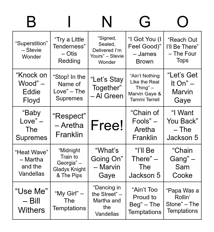 This bingo card has a free space and 30 words: “My Girl” – The Temptations, “Ain’t No Mountain High Enough” – Marvin Gaye & Tammi Terrell, “Respect” – Aretha Franklin, “I Heard It Through the Grapevine” – Gladys Knight & The Pips, “Superstition” – Stevie Wonder, “Signed, Sealed, Delivered I’m Yours” – Stevie Wonder, “Stop! In the Name of Love” – The Supremes, “What’s Going On” – Marvin Gaye, “Chain of Fools” – Aretha Franklin, “Dancing in the Street” – Martha and the Vandellas, “I Want You Back” – The Jackson 5, “Papa Was a Rollin’ Stone” – The Temptations, “Ain’t Too Proud to Beg” – The Temptations, “You Can’t Hurry Love” – The Supremes, “Let’s Get It On” – Marvin Gaye, “Soul Man” – Sam & Dave, “I’ll Be There” – The Jackson 5, “Heat Wave” – Martha and the Vandellas, “Midnight Train to Georgia” – Gladys Knight & The Pips, “Reach Out I’ll Be There” – The Four Tops, “Baby Love” – The Supremes, “Love Train” – The O’Jays, “Try a Little Tenderness” – Otis Redding, “Ain’t Nothing Like the Real Thing” – Marvin Gaye & Tammi Terrell, “Knock on Wood” – Eddie Floyd, “I Got You (I Feel Good)” – James Brown, “Chain Gang” – Sam Cooke, “Use Me” – Bill Withers, “Let’s Stay Together” – Al Green and “Midnight Hour” – Wilson Pickett.