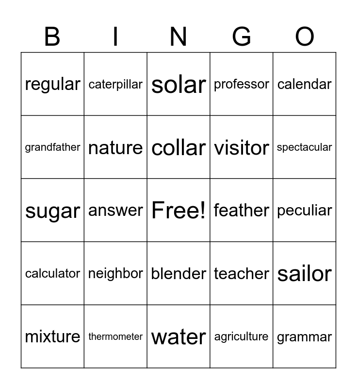This bingo card has a free space and 32 words: agriculture, hammer, answer, measure, calculator, nature, calendar, sailor, caterpillar, skyscraper, collar, solar, elevator, temperature, feather, ancestor, mixture, sugar, blender, neighbor, teacher, flower, peculiar, thermometer, grammar, professor, visitor, grandfather, regular, water, literature and spectacular.
