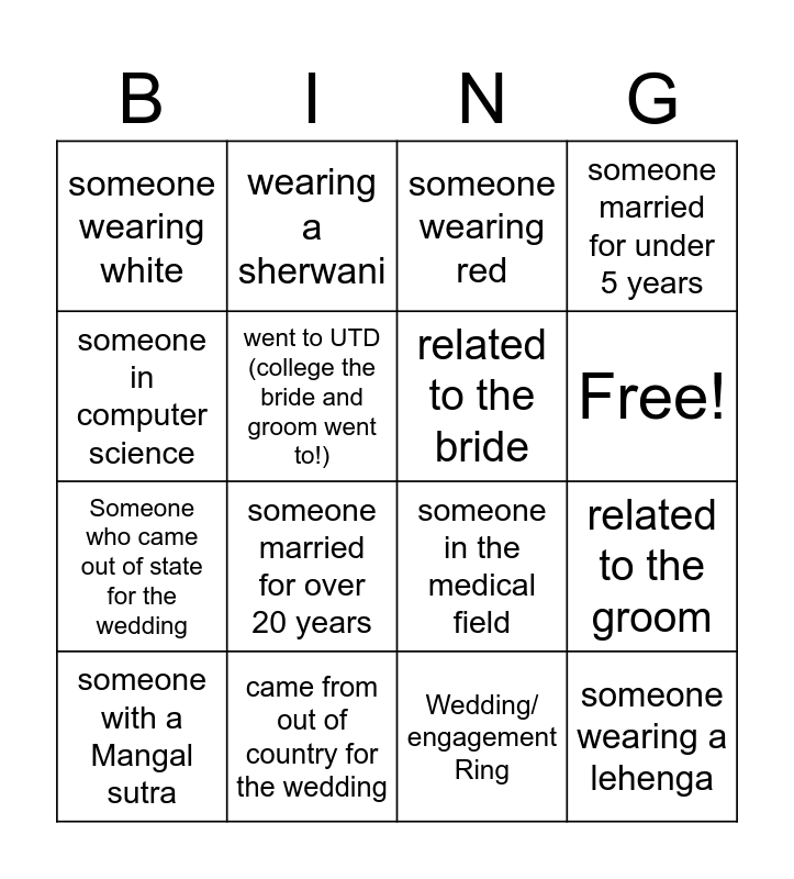 This bingo card has 17 words: Wedding/ engagement Ring, someone with a Mangal sutra, someone wearing red, someone wearing white, someone married for over 20 years, someone married for under 5 years, related to the groom, related to the bride, Free!, went to UTD (college the bride and groom went to!), came from out of country for the wedding, someone in the medical field, someone in computer science, wearing a sherwani, Someone who came out of state for the wedding, friends of the bride or groom and someone wearing a lehenga.