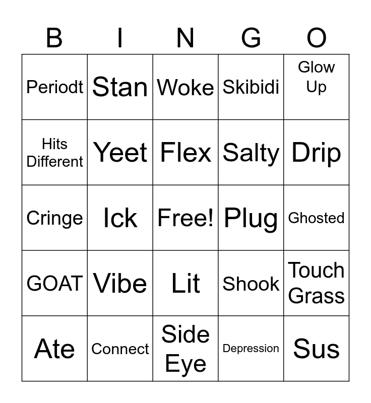 This bingo card has a free space and 68 words: Rizz, Sus, Drip, Bet, Cap, Simp, Stan, Slay, Flex, Yeet, Lit, Bussin, Ghosted, Glow Up, High Key, Hits Different, Ick, Periodt, Mid, Vibe, Salty, Shook, GOAT, Tea, Aura, Delulu, Fam, Bruh, Touch Grass, Main Character, Woke, Snack, L, Grind, Skibidi, No Cap, Sigma, Ate, Drip, Cringe, Lowkey, Simp, Yeet, Sheesh, Brain rot, On God, Dub, Hus, Plug, Connect, Huzz, Chopped, Cooked, Side Eye, Glaze, Big Back, Depression, PTSD, ADHD, Eating Disorder, Anxiety, SUD, Self Esteem & Identity Issues, Deep Breathing, Grounding, Affirmations, Journaling and Bullying.