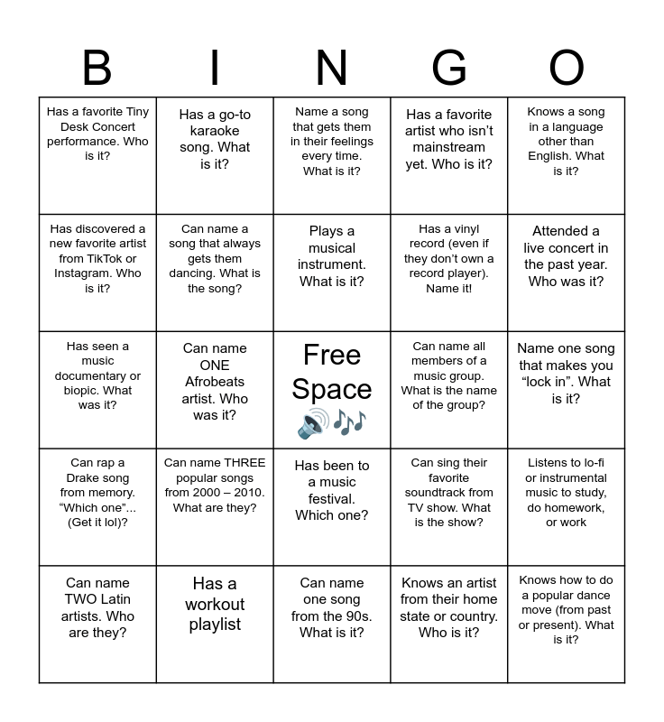 This bingo card has a free space and 24 words: Can name THREE popular songs from 2000 – 2010. What are they?, Has a workout playlist, Plays a musical instrument. What is it?, Can name TWO Latin artists. Who are they?, Knows a song in a language other than English. What is it?, Has a favorite Tiny Desk Concert performance. Who is it?, Has discovered a new favorite artist from TikTok or Instagram. Who is it?, Has a go-to karaoke song. What is it?, Can name all members of a music group. What is the name of the group?, Has been to a music festival. Which one?, Has a vinyl record (even if they don’t own a record player). Name it!, Has seen a music documentary or biopic. What was it?, Can sing their favorite soundtrack from TV show. What is the show?, Listens to lo-fi or instrumental music to study, do homework, or work, Can name a song that always gets them dancing. What is the song?, Knows an artist from their home state or country. Who is it?, Name one song that makes you “lock in”. What is it?, Name a song that gets them in their feelings every time. What is it?, Attended a live concert in the past year. Who was it?, Can name ONE Afrobeats artist. Who was it?, Knows how to do a popular dance move (from past or present). What is it?, Can rap a Drake song from memory. “Which one”... (Get it lol)?, Has a favorite artist who isn’t mainstream yet. Who is it? and Can name one song from the 90s. What is it?.